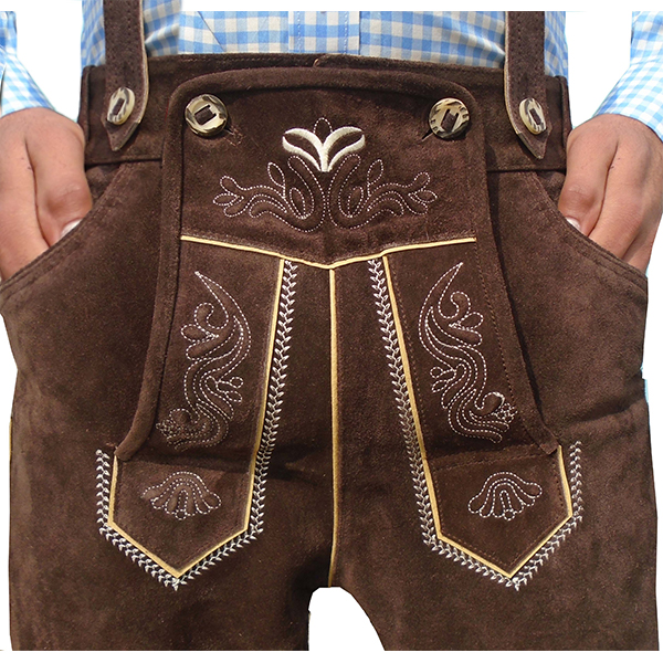 Chocolaty brown suede bundhosen with traditional embroidery, adjustable suspenders, and horn buttons—perfect for Oktoberfest, cultural events, and timeless Bavarian style.
